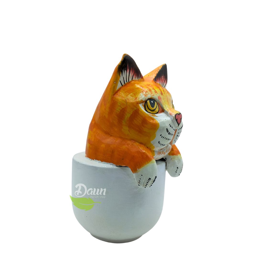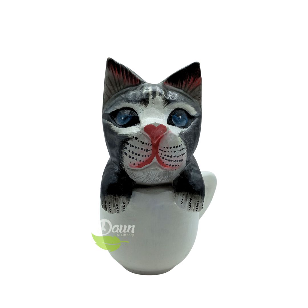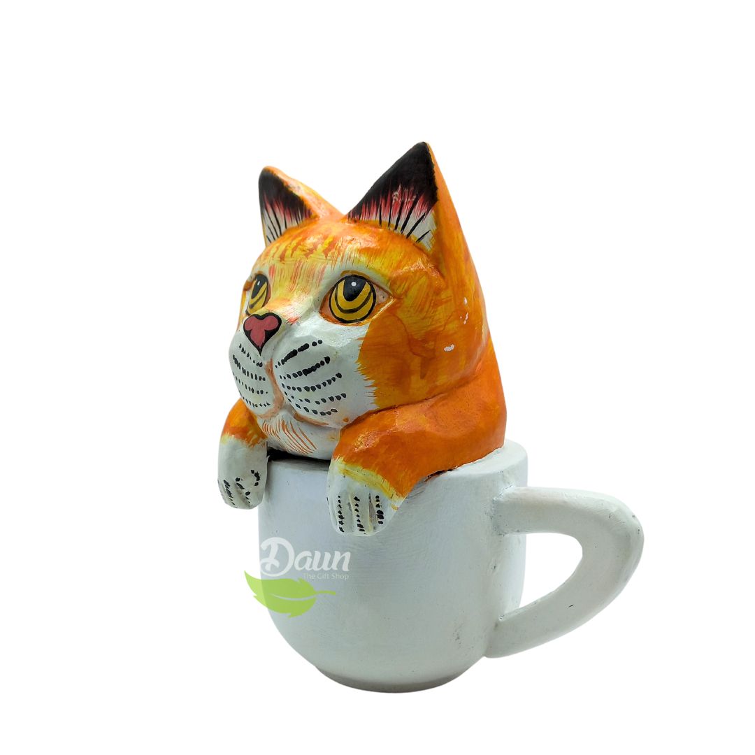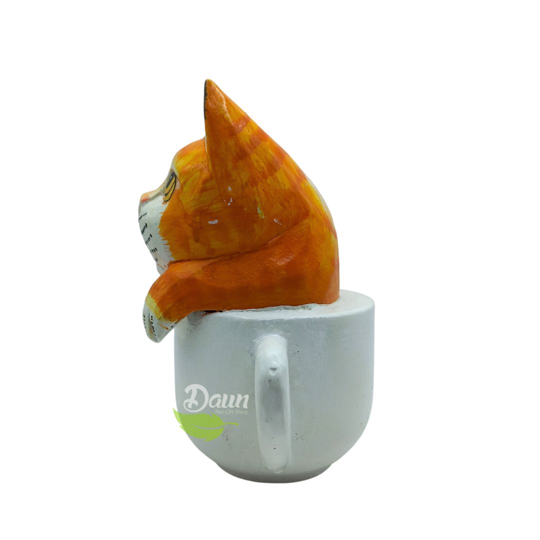 this statue is of a cat in a cup, with it’s head looking forward. the statue is made from wood with handpainted details. the cat look so funny that will make you laught