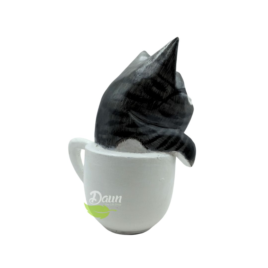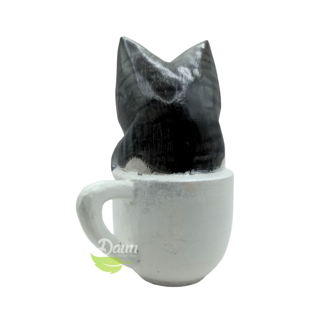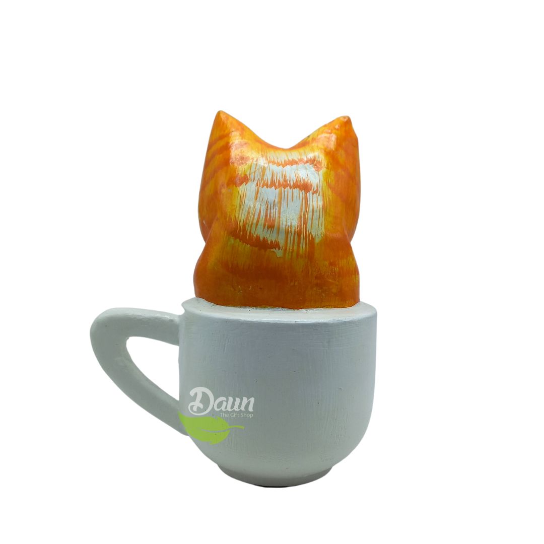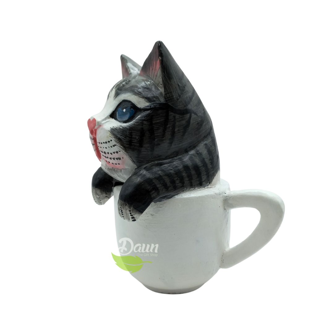 this statue is of a cat in a cup, with it’s head looking forward. the statue is made from wood with handpainted details. the cat look so funny that will make you laught